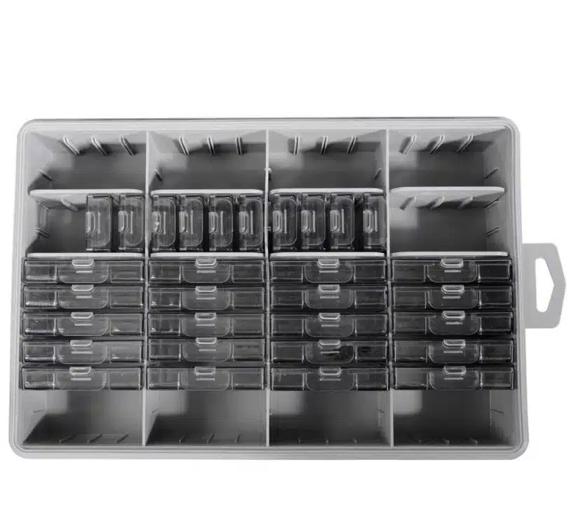 De haken worden opgeborgen in kleine multifunctionele plastic dozen die perfect in de uitsparingen van de doos passen.