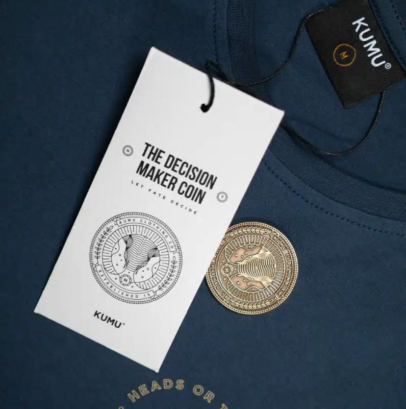 Maker-muntje verborgen in het zwaailabel, voor wanneer je een beetje hulp nodig hebt bij je volgende grote levenskeuze…