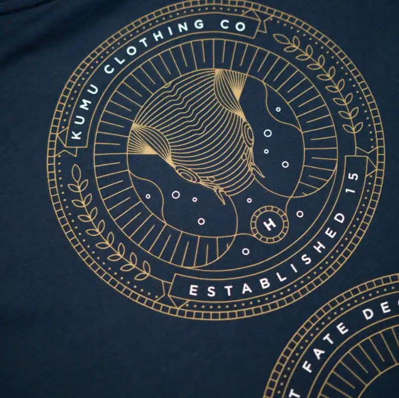 Tweekleurige zeefdruk op een superzachte, diepblauwe stof van 150 g/m² met geweven zijlabeldetails.